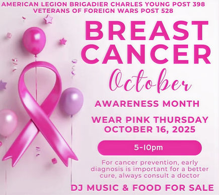 Join American Legion Brigadier General Charles Young Post 398 & Veterans of Foreign Wars Post 528 as we come together to honor October Breast Cancer Awareness Month.